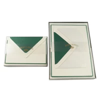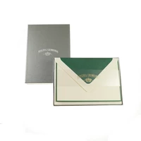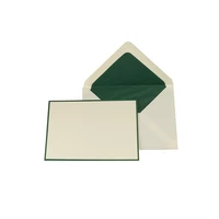 25 Briefkarten im Format DIN A6 (105 x 148 mm) aus feinstem creme farbenem 280g Vergé Papier mit einer leichten Struktur, fast wie handgeschöpft. Mit elegantem dunkelgrünem Rand und dazu passenden Briefumschlägen mit passendem dunkelgrünem Seidenfutter in einer eleganten silbernen Geschenkschachtel verpackt.