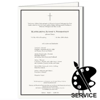 Große Todesanzeige auf feinstem, weißen 105 g/m² handgerissenem Bütten Trauerpapier. Doppelbogen auf DIN A4 (29,7 x 21 cm) gefalzt. Auf den Seiten 1 und 4 jeweils ein ca. 2mm breiter, nach innen versetzter schwarzer Rahmen, die beiden Innenseiten bleiben leer.